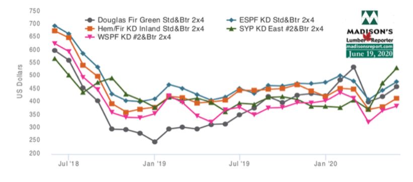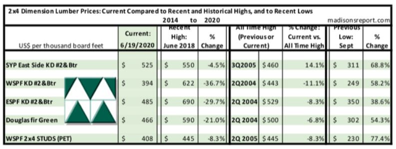 current June 2020 benchmark dimension softwood lumber 2×4 prices