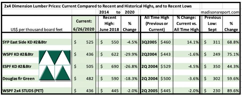 current June 2020 benchmark dimension softwood lumber 2×4 prices