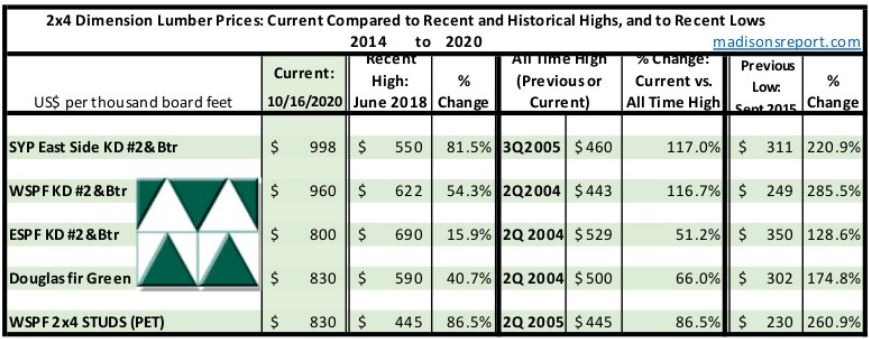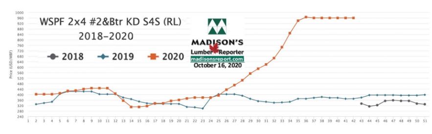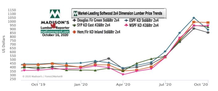 current Oct. 2020 benchmark dimension Softwood Lumber 2×4 prices