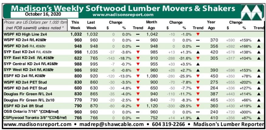 For the week ending Oct. 16, 2020 the price of benchmark softwood