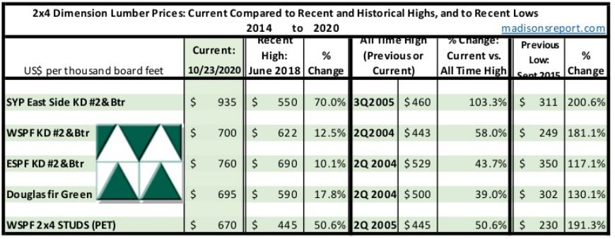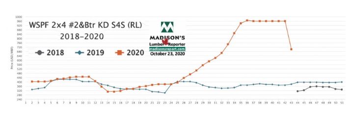 current Oct. 2020 benchmark dimension Softwood Lumber 2×4 prices