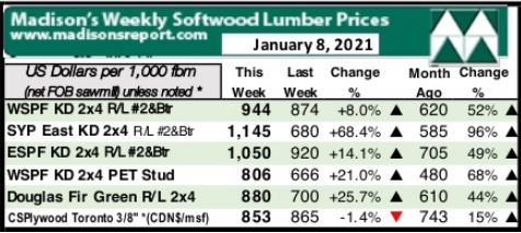 current Jan. 2021 benchmark dimension softwood lumber 2×4 prices,