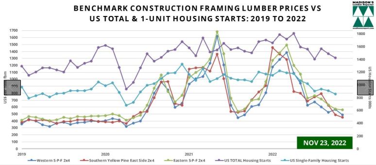As the forest products industry matures into this post-Covid landscape, and the new realities of macroeconomic conditions become more clear, a better picture of cyclical lumber price trends is forming. In the past, solid wood manufacturers were able to rely on a relatively stable seasonal cycle; the beginning of slowdown after Labour Day, with lumber prices dropping until the end of the year. Then more buying in advance of the spring construction season, which brought higher prices usually by February. For the past couple of years that historical annual cycle did not come into play. If the dramatic price increases seen since early 2020 had happened incrementally over the previous decade — for example, up 10% or 15% per year — no one would have thought it unusual. Those price rises were so sharp and happened so suddenly, some people thought that levels must come back down. Now there appears to be a return of seasonal stability in home buying, in new housing construction, and thus for lumber demand as well. However, there are quite a few changes in comparison to the past. The most important for sawmills is that a new floor for dimension lumber prices has been established. The main reason for this is because the cost structure for producers has changed completely. Not just general inflation, but more fundamental – structural – changes to the forest industry and sawmilling which have increased operating costs significantly. Madison's Western S-P-F KD 2x4 #2&Btr Prices: 2020 – 2022 Madison's Western S-P-F KD 2x4 #2&Btr Dimension Lumber Prices: 2020 - 2022 (CNW Group/Madison's Lumber Reporter) Shrewd investors know that construction framing softwood lumber prices are a good leading indicator for US housing activity, including home building and home sales. Don't miss out, get lumber price data updates directly to your desktop every Friday morning. Understanding of these new realities has emerged, and the forest products industry is looking forward to 2023 as players are wondering what to expect. Opinions range widely about forecasts for price points, but there is general agreement about one thing; the wild volatility of the past two years is behind us. So where are future price swings likely to land? To Madison's it seems that Western Spruce-Pine-Fir 2x4 #2&Btr KD (RL) will fluctuate somewhere between US$500 and $700 mfbm. This is because that lower price is very generally the new cost-of-production for most large-volume operators in British Columbia. It is also because industry has become much more savvy since the early-2000s, in terms of responding quickly to market conditions by curtailing production and taking downtime. The habit in the past of continuing to produce lumber despite big drops in demand, thus keeping supply high and driving prices down, is no longer the usual method of operating. Since the beginning of 2021, facilities across North America have noted dropping demand and have responded by reducing production volumes. Madison's Benchmark Top-Six Softwood Lumber and Panel Prices: Monthly Averages Madison’s Benchmark Top-Six Softwood Lumber and Panel Prices: Monthly Averages (CNW Group/Madison's Lumber Reporter) The importance of US housing starts – especially single-family starts – to sawmills cannot be overstated: fully 65% of Canadian softwood lumber sales go to the US, largely for new home building, 10% is sold within Canada, and 6% goes to Japan. Japan lumber purchases are entirely #1/Appearance Grade, or Premium wood, not the standard grade, or #2&Btr, used in North America. October starts of single-family housing, the largest share of the market and construction method which uses the most wood, were down by -6.1% to a rate of 855,000 units. Single-family authorizations were at 839,000 units, which is -3.6% below the September figure of 870,000 units. Building permits are generally submitted two months before the home building is begun, so this data is as indicator of December construction activity. * Madison's Lumber Prices, weekly, are a good forecast indicator of US home builder's current lumber buying activity ——> DETAILS Over the past few years, a close correlation has emerged between those benchmark dimension lumber 2x4 prices and US housing starts (both total and single-family). As this year wanes and 2023 looms ever closer in the horizon, here are some important points to keep in mind, for what can be expected in the coming year