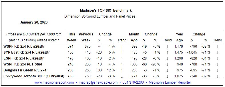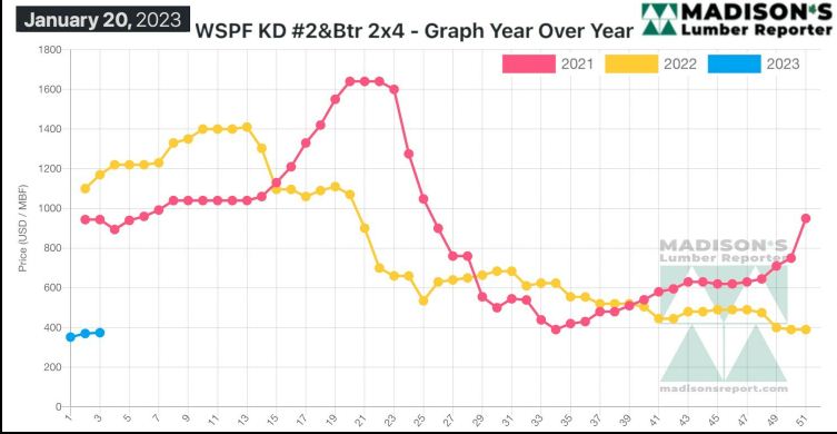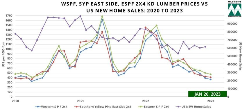 Full-year 2022 US housing starts and new home sales data has been released and while the dampening effects of rising mortgage rates remain, the numbers for December show a slight uptick. In 2022 the US began building 1.55 million homes, just a -3% drop from full-year 2021. Single-family starts in 2022 totalled 1.01 million, down -10.6% from the previous year. Total housing starts in the US for December 2022 were almost flat from the previous month, decreasing only -1.4% to 1.382 million units compared to the revised 1.401 million units reported for November, and dropped -22% from the December 2021 rate of 1.768 million. Building permits were also essentially flat, down by -1.6%, at 1.330 million units from the November rate of 1.351 million. This is -30% below the December 2021 rate of 1.896 million. These will eventually become starts and will help to underpin residential construction. While housing starts were down in full-year 2022, housing completions posted a +3.8% annual gain, rising to an estimated annual rate of 1.392 million housing units. Dropping from the historical highs seen in most of 2022, there were 1.712 million units under construction, 769,000 of those were single-family homes. This is still well above the historical record-high of 1.628 million total units that were under construction in 1973. Benchmark Softwood Lumber Prices January 2023 & US Housing Starts Full-Year 2023 December starts of single-family housing, the largest share of the market and construction method which uses the most wood, rocketed up +11% to a rate of 909,000 units from November's 817,000 units. Single-family authorizations were at 730,000 units, which is -6.5% below the November figure of 781,000 units. Building permits are generally submitted two months before the home building is begun, so this data is as indicator of February construction activity. Shrewd investors know that construction framing softwood lumber prices are a good leading indicator for US housing activity, including home building and home sales. Don't miss out, get lumber price data updates directly to your desktop every Friday morning. Madison's Benchmark Top-Six Softwood Lumber and Panel Prices: Monthly Averages Looking at lumber prices, after a very soft couple of months, in the week ending January 20, 2023, the price of benchmark softwood lumber item Western Spruce-Pine-Fir 2x4 #2&Btr KD (RL) was US$374 mfbm, which is up by +$4 or +1%, from the previous week when it was US$370 mfbm, said weekly forest products industry price guide newsletter Madison's Lumber Reporter. This is down by -$19, or -5%, from one month ago when it was $393. STAY AHEAD of US housing price data by getting access to softwood lumber prices. Released every Friday for that week, since 1952 Madison's Lumber Prices is used by the forest products industry as a price guide for North American construction framing dimension softwood lumber. These are, of course, the inputs into US and Canadian home building materials. The U.S. Census Bureau and the US Department of Housing and Urban Development released January 26 new home sales and house price data. New home sales comprise 10% of real estate activity and are considered a leading housing market indicator as they are recorded when contracts are signed. Also rising after struggling for the second half of last year, sales of new US single-family homes in the US increased for the third month in a row, at 616,000 units, which is up +2.3% from November's 602,000 and is a -26.6% drop compared to December 2021 when it was 839,000. Only 6,000 new homes sold last November were below US$300,000. At the sales pace in December it would take a lengthy 9 months to clear the supply of new houses on the market, down from 9.2 months in November. For full-year 2022 an estimated 644,000 new homes were sold, which is -16.4% below the 2021 figure of 771,000. There were 461,000 new homes on the market at the end of last month, unchanged from November. Houses under construction accounted for 63.1% of the inventory, with homes yet to be built making up 21.5%. Completed houses accounted for 15.4% of the inventory, well below a long-term average of 27%. US NEW Home Sales December 2022 & Benchmark Softwood Lumber Prices January 2023 After seemingly relentless climbs, the median sales price in December dropped again, down by -3.7% to US$442,100, from US$459,100 in November, and is up +7.8% from one year ago. As for those lumber prices, compared to the same week last year, when it was US$1,170 mfbm, the price of Western Spruce-Pine-Fir 2x4 #2&Btr KD (RL) for the week ending January 20, 2023 was down by -$796, or -68%. Compared to two years ago when it was $944, that week's price is down by -$570, or -60%. Benchmark Dimension Softwood Lumber Prices: January 2023 To subscribe to Madison's Lumber Reporter, simply fill out an order form here: https://madisonsreport.com/subscribe/ Madison's Lumber Prices: https://madisonsreport.com/products/madisons-reporter/ Madison's Heating Wood Pellet Prices: https://madisonsreport.com/products/madisons-north-american-heating-wood-pellet-price-report/ Madison's British Columbia Coast Log Prices: https://madisonsreport.com/bc-coastal-log-prices/ Madison's Forest Pulse: https://madisonsreport.com/products/forest-pulse/ Source: Madison's Lumber Reporter |
