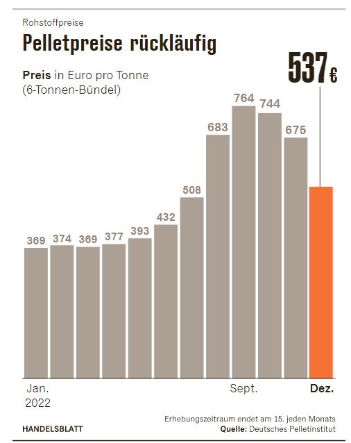 Pellet prices have moved 2022 to record levels. In January, the prices for wood pellets fell again for the fourth time in a row. A trend ? According to German media reports: Düsseldorf Heating with pellets continues to gain popularity in light of the energy crisis. According to the German Energy Wood and Pellet Association (Deutscher Energieholz- und Pellet-Verband), 570,000 heaters and furnaces with the energy source were already available nationwide – trend increasing. Pellet prices, like natural gas, have seen a rally in recent months. Over the course of the year, the price for one tonne in a six-tonne bundle of 366 euros in January rose to 764 euros in September. Consumers are therefore unsure of what to expect. Why are pellets suddenly so expensive? Will prices fall in the foreseeable future? Is heating with wood and converting to pellet heating even worthwhile? When is the best time to buy pellets? How many tons do you actually need per year? The most important questions and answers at a glance. Heating with wood: How much does a ton of pellets cost? One ton cost an average of 499 euros nationwide in mid-January. This is still more than 133 Euro than in the same period last year. However, the pellet price in December 2022 was still 537 euros. The price is falling for the fourth time in a row, as data from the German Pelletin Institute (DEPI), an industry association, show. DEPI regularly raises pellet prices to 15. every month. Pellet prices: Why are pellets so expensive? "So far, there has been an oversupply of pellets," explains Martin Bentele, Managing Director of DEPI. There were more pellets than were heated. According to data, German manufacturers exported around 200,000 tonnes last year. This has also been reflected in prices in recent years. The average annual increase was between 2012 and 2021 at a moderate 0.24 percent, data from the DEPI show. But things were different this summer. Demand was three times greater than supply," says Emil Sopper of the Baywa conglomerate, one of Germany's largest pellet dealers. More and more consumers are switching to wood heating. "Demand has increased sharply since the war in Ukraine," says Bentele, an expert who believes that consumers are afraid of gas shortages and are hoping for lower heating costs compared to fossil fuels. "Many existing heating operators are also panicking and are buying in stock," Bentele said. Production cannot respond quickly enough to the increased demand. "Manufacturers are planning more plants, but it takes an average of two years for them to be operational and more can be produced. "Hamster purchases drove prices up even more. In addition, the high energy prices also make production more expensive. Producing pellets is very energy-intensive," Bentele explains. Logistics also caused problems. There were no special trucks capable of loading wood pellets into the tank with a built-in vacuum cleaner. We had already ordered ten new trucks last year," says Holzpellet dealer Sopper. Not a single truck has been delivered yet – the truck manufacturer is missing assembly parts due to interrupted supply chains. When will pellets become cheaper again? Pellet prices have been falling since October 2022. Wood pellet prices also fell significantly in November and December. The rising trend has stopped," Bentele says. Demand is declining and most consumers' warehouses are filled. Dealer Sopper also sees sustainable relaxation." We have a functioning market for pellet prices," he says. Demand has fallen as existing customers' warehouses are now filled. "Now new customers or large commercial customers are buying more," Sopper explains. Source: handelsblatt.com |