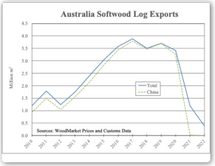 At the end of 2020, China banned the importation of plantation pine logs from Australia, stating that bark beetles had infected the logs. This decision resulted in a collapse of Australian exports as China was practically the only log market being served. As a result, total shipments from Australia fell from over 3.5 million m3annually during 2016-2020 to less than 400,000 m3 in 2022 (see chart). When the ban was implemented, Australian log traders started exploring alternative destinations in Asia and, in 2021, shipped about 1.2 million m3 of logs to previously insignificant markets, including India, South Korea, and Vietnam (as reported on the new platform WoodMarket Prices (Wood Resources International). However, the jump in shipments to those markets was short-lived, and a sharp drop occurred in 2022, partly because of increased competition from US log exporters. The decline continued in early 2023, with only 27,000 m3 being shipped in the first three months of the year, compared to 112,000 m3 during the same period in 2022. Australia will likely have opportunities to reestablish trade with China now that the ban has been lifted, but shipments will probably not reach levels seen in the past. Previously, a large share of the pine logs Australia shipped to China was of lower grades, close to "pulplog" material-type wood, which was less desirable for Australian sawmills. However, the domestic industry in Australia will increasingly compete with the export market for small-diameter logs as log supply tightens across the country. With the limited expansion in pine plantations over the past 30 years (0.3% annually), the domestic timber supply is unlikely to increase in the coming decades. In addition, many large pine plantations were destroyed by fires in 2019 and 2020 (roughly 6% of the plantation area), which will even further limit log availability for domestic sawmills in the short- and medium-term horizons. Three venues can meet a predicted increase in lumber demand in Australia: 1. Upgraded sawmills that can utilize smaller logs and increase their lumber yields, 2. Increased lumber imports, and 3. Decreased log exports. However, with the outlook of softwood lumber prices increasing worldwide, the importation of lumber from Europe could become costlier. This scenario could open opportunities for shipments of logs and lumber from New Zealand to Australia in the coming decade (this would require higher timber qualities than for logs shipped to China). To have sufficient domestic softwood timber supply longer-term, the conifer plantation area in Australia must be significantly increased. |