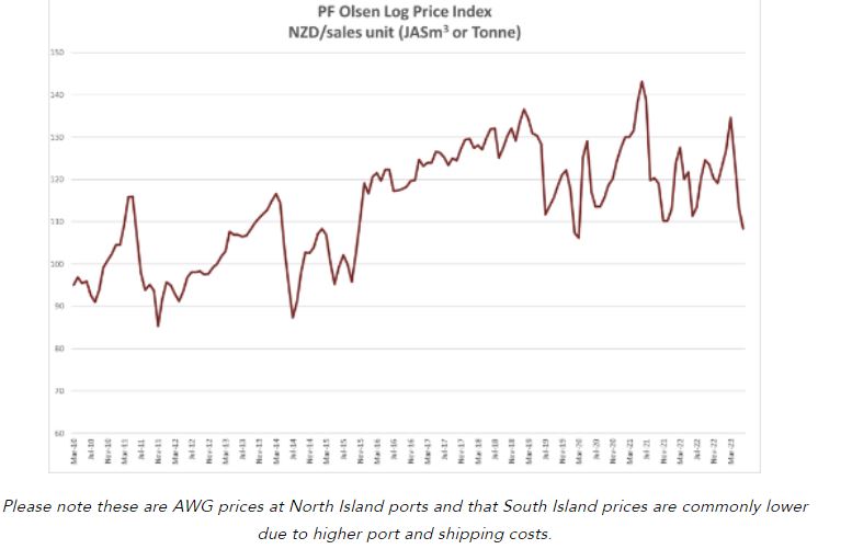 Chinese log buyers continue to struggle with credit issues and log demand in New Zealand is reducing as construction activity declines due to high inflation and interest costs. AWG (At Wharf Gate) prices dropped 5-10 NZD per JASm3 with the larger drops at South Island ports. Some mills and forest owners have already pre-empted Quarter 3 pricing and reduced prices for domestic logs to preserve supply chains. There is general agreement we are at the bottom of this export price cycle, but few are bold enough to make predictions about the rate of recovery. Harvest volumes are reducing significantly in New Zealand which will help with the supply/demand balance. The June PF Olsen Log Price Index decreased $5 to $103. The index is the lowest since March 2020 when markets were impacted by COVID-19 lockdowns. The index is currently $12 below the two-year average and $15 below the five-year average. Domestic Log Market There is strong demand and enquiries for clearwood timber from Europe and the USA. There has been reduced supply of clear boards with Pan Pac Forest Product’s Whirinaki mill in Napier being inoperable since Cyclone Gabrielle in February. Sales of the mid to lower grades produced by these mills cutting pruned logs are more of a challenge. There are high stocks of premium decking around New Zealand, and timber prices in Asia are falling although lower prices are offset partially by lower freight costs. Production of structural timber is well ahead of sales with mills now looking at difficult decisions on how to reduce timber production. Australia is also not a lucrative market as they can buy cheaper product from the Baltic countries. Export Log Market China China softwood log inventory has increased slightly to about 4m m3 with radiata accounting for about 3.15 m3. Port off-take has remained steady ranging round 70-75k m3 per day. Supply volume from New Zealand will drop significantly over the next couple of months as many forest owners in New Zealand have stopped or slowed down harvest operations. Many ports in New Zealand have now restricted log deliveries to four days a week, as there is insufficient supply to justify remaining open all week. As predicted last month, there hasn’t yet been any log imports from Australia. The CFR price for A grade radiata logs in China has bottomed at 105 USD per JASm3, and log exporters are currently offering sales at 110 USD for A grade. Domestic wholesale log prices in China have now stabilised. The local Masson pine mentioned in last's month report is mainly produced in the southwestern provinces of Guanxi, Yunnan and Sichuan. When pine logs from New Zealand cost more than 120 USD then this local pine will have a market share of 30-40% These forests are untended so generally produce small size logs. This supply doesn’t impact major destinations of pine from New Zealand such as Lanshan, Taicang and Zhenjiang. Between January and May this year China imported 15% (7.8m m3) more sawntimber than the same period last year. This sawntimber is mostly used in construction. The China Caixin manufacturing PMI unexpectedly rose to 50.9 in May from 49.5 in April. Output rose the most in 11 months, new order growth was at a two year-high, and foreign sales continued to increase. India Electric supply was out for two weeks in Kandla after India was hit by Cyclone Biparjoy. Logs stored in the open got drenched and most will require two to three weeks of drying before they are suitable for production to resume. There is already about 180,000 m3 of unsold logs at customs bonded warehouse and some are under auction for duty not paid. Exchange rates The NZD strengthened slightly against the USD in they first half of June, but has weakened in the second half. The CNY has weakened against the USD reducing the buying power of Chinese log buyers. Ocean freight Freight costs have dropped due to a drop in global freight demand and the cost is now mid 20s USD per JASm3 for a two port load from the North Island of New Zealand to China. The Baltic Dry Index is a composite of three sub-indices, each covering a different carrier size: Capsize (40%), Panamax (30%), and Supramax (30%). It displays an index of the daily USD hire rates across 20 ocean shipping routes. Whilst most of the NZ log trade is shipped in Handysize vessels, this segment is strongly influenced by the BDI. PF Olsen Log Price Index - June 2023 The June PF Olsen Log Price Index decreased $5 to $103. The index is the lowest since March 2020 when markets were impacted by COVID-19 lockdowns. The index is currently $12 below the two-year average and $15 below the five-year average. Source:interest.co.nz |