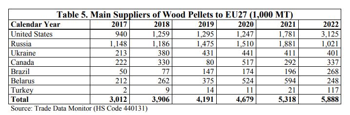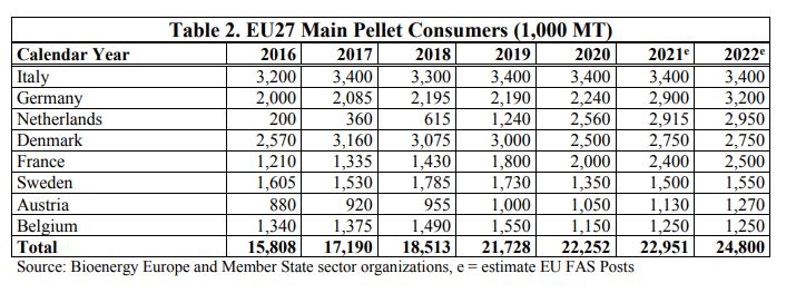 The European Union consumed a record 24.8 million metric tons of wood pellets in 2022, according to a report filed with the USDA Foreign Agricultural Service¡¯s Global Agricultural Information Network. Consumption is expected to grow to 25.6 million metric tons this year. The report attributes much of last year¡¯s growth in EU wood pellet consumption to increased residential use. Additional consumption this year is also expected to come primarily from residential demand supported by member state (MS) incentives and the implementation of the third Renewable Energy Directive (REDIII). The report notes that EU demand for wood pellets has significantly outpaced domestic production over the past decade, resulting in increased imports of wood pellets, primarily from the U.S., Russia, Belarus and Ukraine. Last year, the EU imported an estimated 5.89 million metric tons of wood pellets at a value of $1.32 billion. A ban on wood pellet imports from Russia in mid-2022 has created additional demand for product sourced from other regions. The EU is expected to consume 25.6 million metric tons of wood pellets this year, up from an estimated 24.8 million metric tons in 2022, and 22.951 million metric tons in 2021. EU wood pellet imports are estimated at 6.2 million metric tons for 2023, down from 6.888 million metric tons in 2022, but up from 5.318 million metric tons in 2021. According to the report, data on the number of EU-based wood pellet plants is currently unavailable for 2022 and 2023. There were, however, an estimated 774 wood pellet plants in the EU as of 2021, up from 753 in 2020. Total capacity is currently estimated at 27.2 million metric tons, up from 25.6 million metric tons last year and 25.6 million metric tons in 2021. Capacity use is forecast at 76.1 percent this year, down from 76.6 percent last year and 76.7 percent in 2021. Domestic production is expected to reach 20.7 million metric tons this year, up from 20.3 million metric tons in 2022 and 19.631 million metric tons in 2021. The EU is currently expected to export 1.5 million metric tons of wood pellets in2023, up from 1.487 million metric tons in 2022, but down from 2.208 million metric tons in 2021. Italy was the EU¡¯s top consumer of wood pellets last year at 3.4 million metric tons, followed by Germany at 3.2 million metric tons and the Netherland at 2.95 million metric tons. Germany is the EU¡¯s top producer of wood pellets, with production at 3.57 million metric tons last year, followed by Latvia at 2.15 million metric tons and France at 2.05 million metric tons. The Netherlands is the EU¡¯s top importer of wood pellets, with 3.104 million metric tons imported last year, followed by Denmark at 2.66 million metric tons and Italy at 1.916 million metric tons. The U.S. was the top supplier of wood pellets to the EU last year, at approximately 3.125 million metric tons, followed by Russia at 1.021 million metric tons and Ukraine at 401,000 metric tons. The top EU-based importer of U.S. wood pellets in 2022 was the Netherlands at 1.873 million metric tons, followed by Denmark at 560,000 metric tons and Belgium at 489,000 metric tons. Source: USDA |