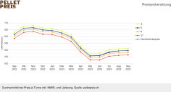 At an average of 496.90 Swiss francs per tonne, the Swiss pellet price in September 2023 has risen by 0.6 per cent compared to the previous month. This is reported by the internet portal Pelletpreis.ch. According to Pelletpreis.ch, the Swiss pellet price in September 2023 is 19.4 percent lower than a year ago, when it was 616.50 Swiss francs. The current average price is based on information from 24 suppliers. Swiss pellet price in June 2023 for a purchase of 3 tonnes: 512.96 francs Swiss pellet price in June 2023 for a purchase of 5 tonnes: 495.50 Swiss francs Swiss pellet price in June 2023 if 8 tonnes are purchased: 482.14 Swiss francs Swiss pellet price in June 2023 for a purchase of 17 tonnes: 464.17 Swiss francs The pellets burned in Switzerland do not come from a distant country like heating oil and gas, but 80 percent are produced in Switzerland, according to Pelletpreis.ch. The rest comes from Germany and Austria. |