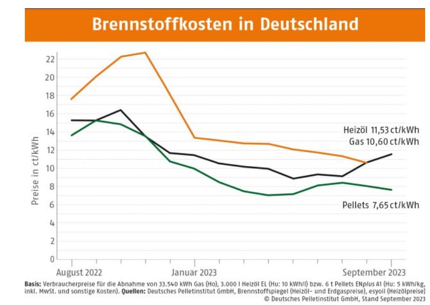Pellet prices have fallen further and are currently below the prices for oil and gas. The current price per ton on 13.10. Berlin. In the wake of the energy crisis, demand for wood and pellet stoves rose sharply. But the tide has turned. The German government's Building Energy Act has apparently scared off many interested parties. "The market has completely collapsed in some cases," says Anna Katharina Sievers of the German Pellet Institute. The sales forecast for 2023 has not been reached, she says. However, the falling demand also has its advantages: pellet customers can benefit from the currently favourable prices. What are the current pellet prices? Our overview shows the current price per tonne of pellets as of today, 13 October. The data in the following table is based on information from "Heizpellets24" and shows the pellet prices per tonne. The table is updated regularly. Date Pellet prices per tonne Pellet prices from 9 October 348.41 Euro Pellet prices from 10 October 346,16 Euro Pellet prices from 11 October 346,35 Euro Pellet prices from 12 October 346.08 Euro Pellet prices from 13 October 345.95 Euro Average pellet prices in Germany remain virtually unchanged. After a slight downward trend was observed at the beginning of the month, prices have remained at an almost constant level since this week. Current pellet prices: Order or wait? Pellets still have a price advantage over heating oil and gas. In September, the average price per kilowatt hour (kWh) for pellets was 7.65 cents, lower than for heating oil (11.53 cents/kWh) and gas (10.60 cents/kWh). The German Pellet Institute (DEPI), an association that represents the interests of the German pellet industry, also recorded increased production of pellets for the second quarter of 2023, which has pushed the price down. Whether this development will continue remains to be seen. Basically, the following applies: Prices are currently low - a purchase can be worthwhile. The graph shows: Pellets are still a cheaper fuel compared to heating oil and gas. Photo: DEPI/Press Graphic Current pellet prices (09/23): Regional prices - the differences by federal state In addition to the time of year, the place of residence is also important. Because there are sometimes significant differences between the federal states. The reason: wood is processed differently in the individual regions and different amounts of residual wood accumulate. Pellets are a regional fuel - therefore prices can also differ from region to region. Roughly speaking, this can be broken down into North/East, Central and South. The data comes from energienutzer.de - as of September 2023. Region Federal states Pellet prices per tonne (as of 09/2023) --------------------------------------------------------------------------------------------- North/East Berlin, Brandenburg, Bremen, Hamburg, Mecklenburg-Western Pomerania, Lower Saxony, Schleswig-Holstein no information at present Middle Hesse, North Rhine-Westphalia, Rhineland-Palatinate, Saxony, Saxony-Anhalt, Thuringia 380.29 euros South Bavaria, Baden-W¨¹rttemberg, Saarland 382.34 euros --------------------------------------------------------------------------------------------- During the energy and price crisis, the differences between the individual federal states were sometimes much greater. In the meantime, prices have come very close together. There is currently hardly any difference between the south and the centre - but sometimes people in federal states like Hesse, North Rhine-Westphalia and Rhineland-Palatinate even get off a little cheaper. For the north, "energienutzer.de" does not currently provide any information. ¡¡ |