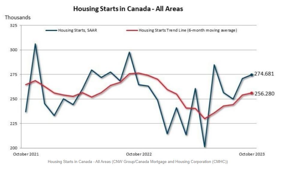 In a recent update, the Canada Mortgage and Housing Corporation (CMHC) reported an upward trend in housing starts for October 2023. This trend, showing a 1% increase to 256,280 units from September¡¯s 253,957 units, suggests a resilient housing market despite ongoing economic challenges. The trend measure, a six-month moving average of the monthly seasonally adjusted annual rate (SAAR) of total housing starts, offers a broader perspective on the housing market across Canada. Key Findings for October 2023: Overall Housing Starts: The monthly SAAR of total housing starts for all areas in Canada rose by 1% in October, reaching 274,681 units, compared to 270,669 units in September. Urban Housing Starts: In urban centers with a population of over 10,000, housing starts increased by 2% to 257,357 units. This includes a 1% rise in multi-unit urban starts (209,887 units) and a significant 9% increase in single-detached urban starts (47,470 units). Regional Variances: Notable regional differences were observed, with total SAAR housing starts experiencing a decline of 43% in Montreal and 24% in Toronto. In contrast, Vancouver saw a substantial increase of 35%, propelled by a 40% rise in multi-unit starts. Rural Housing Starts: The rural starts monthly SAAR was estimated at 17,324 units. Economic Insights: Bob Dugan, CMHC¡¯s Chief Economist, highlighted that despite the positive trend in October, driven largely by ongoing activity in multi-unit starts, the actual year-to-date starts have seen a decline. Dugan emphasized the need for innovative approaches to deliver more housing and address the supply gap in the current economic environment. Additional Data: Year-to-Date Comparisons: In 2023, actual year-to-date housing starts in Toronto and Vancouver were higher by 22% and 37%, respectively, compared to the same period in 2022, primarily due to an increase in multi-unit starts. National Perspective: Nationally, actual year-to-date housing starts in centers with over 10,000 population were down by 7%, mainly attributed to a decrease in single-detached starts. Source: woodindustry.ca |