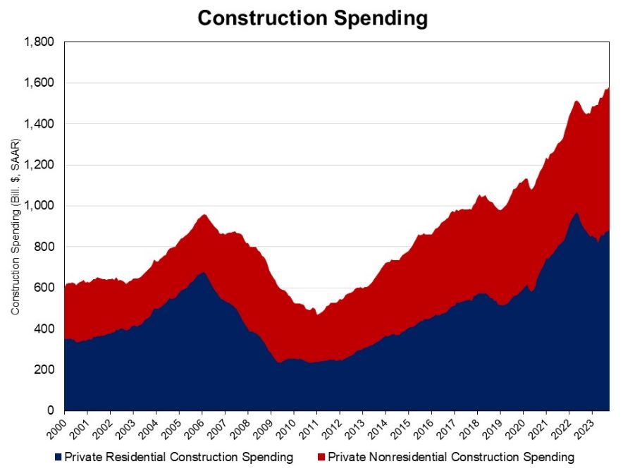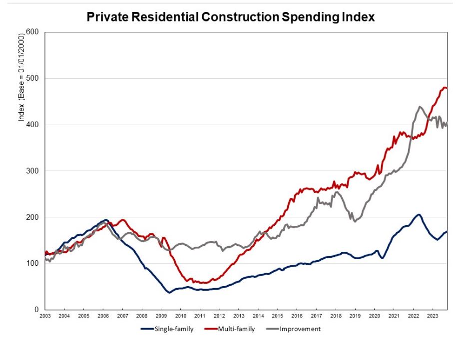 NAHB analysis of Census Construction Spending data shows that private residential construction spending rose 1.2% in October, after a dip in September. It stood at a seasonally adjusted annual pace of $884 billion. Total private residential construction spending is 0.7% higher compared to a year ago. This was the first year-over-year increase since December 2022. The total construction monthly increase is attributed to more spending on single-family construction and improvements. Spending on single-family construction rose 1.1% in October. It was the sixth consecutive monthly increase since April 2023. Compared to a year ago, spending on single-family construction was 1.4% lower. Multifamily construction spending dipped 0.2% in October, as a large stock of multifamily housing is under construction and rental vacancy rate rose to 6.6% in the third quarter from a record low of 5.6%. Private residential improvement spending increased 2% in October but was 2% lower compared to a year ago. Keep in mind that construction spending reports the value of property put-in-place. Per the Census definition: The ˇ°value of construction put in placeˇ± is a measure of the value of construction installed or erected at the site during a given period. The total value-in-place for a given period is the sum of the value of work done on all projects underway during this period, regardless of when work on each individual project was started or when payment was made to the contractors. For some categories, published estimates represent payments made during a period rather than the value of work done during that period. The NAHB construction spending index, which is shown in the graph below (the base is January 2000), illustrates how construction spending on single-family has slowed since early 2022 under the pressure of supply-chain issues and elevated interest rates. Multifamily construction spending has had solid growth in recent months, while improvement spending has slowed since mid-2022. Before the COVID-19 crisis hit the U.S. economy, single-family and multifamily construction spending experienced solid growth from the second half of 2019 to February 2020, followed by a quick post-covid rebound since July 2020. Spending on private nonresidential construction was up 22.4% over a year ago. The annual private nonresidential spending increase was mainly due to higher spending on the class of manufacturing category ($86 billion), followed by the power category ($11 billion). Source: NAHB |