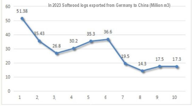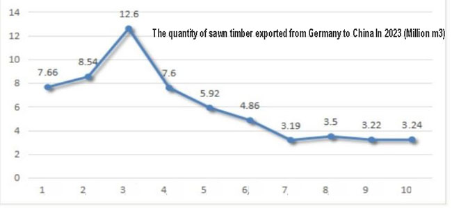 From January to October this year, German exports of coniferous logs to China fell by about 38 per cent year-on-year to a total of 2.84 million m3. This year's German exports of coniferous logs to China have shown an overall downward trend, from 510,000m3 in January to 170,000m3 in October. The local German logging industry has not yet recovered to the level of the beginning of this year, and it is expected that German log exports to the Chinese market will remain low in the fourth quarter of 2023. German sawn timber exports to China rose by about 52 per cent year-on-year to a total of 600,000 m3. Since peaking at 126,000 m3 in March this year, the downward trend has been clear. The four months from July to October maintained a relatively stable volume of sawn timber exports. In addition, because of the changing international situation, Germany replaced Russia as one of the main timber suppliers to the EU. So even in 2024, after the German timber industry has resumed harvesting, it is likely that its timber exports to China will not suddenly increase to return to the previous level. |