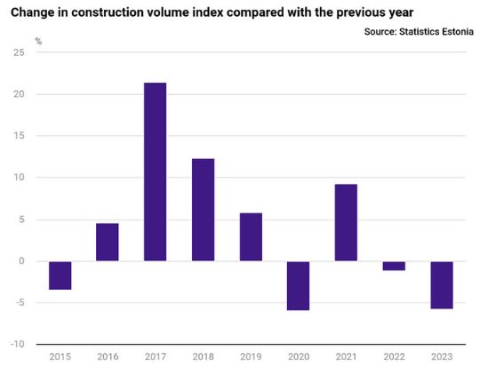 According to preliminary data provided by Statistics Estonia, in 2023, the total production value of Estonian construction enterprises, domestically and abroad, decreased by 6 percent at constant prices compared to 2022. On the domestic market alone, there was a 7 percent fall in construction volumes. The total production value of construction enterprises was €4.1 billion. Building construction accounted for €2.6 billion of this, with civil engineering amounting to a further €1.5 billion. Compared with 2022, building construction volumes were down by 11 percent, whereas the volume of civil engineering works (roads, bridges, port facilities, pipelines, communication and electricity lines, sports fields, etc.) rose 4 percent. Merike Sinisaar, leading analyst at Statistics Estonia, said that the construction market in 2023 was affected by the continued rise in construction prices and higher interest rates, as well as declining consumer confidence. "The domestic construction market was mainly influenced by the decreased volume of building construction. There was a decline both in new building construction and in the volume of repair and reconstruction works. The increase in the volume of civil engineering was mainly due to repair and reconstruction works," Sinisaar said. The construction volume of Estonian construction enterprises operating abroad grew by 18 percent in 2023 compared to 2022. There were increases in both building construction and civil engineering works completed abroad. Construction in foreign countries accounted for 7 percent of Estonia's total construction volume, up from 5 percent in 2022. According to the Register of Construction Works, 8,424 new dwellings were completed in 2023, which is 29 percent more than the year before. The majority (68 percent) of new dwellings were in apartment blocks, the most popular being blocks with 3-5 stories. Among dwellings completed, those with two rooms were the most numerous. This was followed by dwellings with four rooms and then dwellings with three rooms. The number of dwellings with three rooms increased the most last year. The average floor area of new dwellings was 86 square meters. Most of the completed dwellings are in Tallinn, followed by the rural municipalities in the vicinity of Tallinn, and Tartu County. The demand for new dwellings continued to fall for the third consecutive year. Building permits were issued for the construction of 5,612 dwellings, which is almost a fifth less than the year before. Apartment blocks remains the most popular type of residential building. In 2023, the number of non-residential buildings completed was 1,036 with a combined usable floor area of 818,600 square meters. New industrial, warehouse and office premises accounted for the biggest share of non-residential buildings constructed. Compared to 2022, there was an increase in both the usable floor space and the overall volume of completed non-residential buildings. In the fourth quarter (Q4) of 2023, the total production value of Estonian construction enterprises was €1.2 billion, which is 4 percent more than in Q4 of 2022. The volume of building construction fell by 4 percent and the volume of civil engineering works rose by around a fifth. Source: news.err.ee |