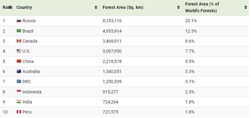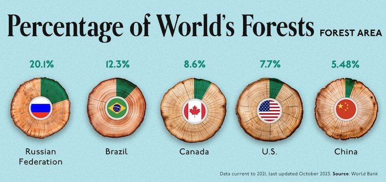 ![]() Since the last ice age, the Earth¡¯s forest cover has fallen by 20 million km2 or 2 billion hectares. Half of the loss occurred since the year 1900 due to expanding agriculture and industrialization. Now forests cover about 30% of the Earth¡¯s land, about 40 million km2, distributed unevenly across the globe. We visualize the top 15 countries with the largest forests, measured in square kilometers. Data for this visualization and article comes from the World Bank, using data for 2021 that was last updated in October 2023. Ranked: Top 15 Countries with the Biggest Forests Predictably, the largest country in the world also has the biggest forest area. Nearly 50% of Russia is forest, measuring roughly 8 million km2. This is bigger than the total land area of every other country in the world¡ªwith the exception of China, the U.S., Canada, Brazil, and Australia. It also means one-fifth of the world¡¯s entire forested area is in Russia. Most of Russia¡¯s forests are boreal, to survive the colder, drier climes in the country, and are made up of deciduous and coniferous tree species including larch, pine, spruce, and oak. While Russia is home to more forest land than any other country, the largest single forest in the world is the Amazon Rainforest in South America. At second place, Brazil has nearly 5 million km2 of forest cover (about 12% of the world¡¯s forests), thanks to almost two-thirds of the Amazon rainforest inside its borders. For context, Brazil¡¯s forested area is almost twice the size of Saudi Arabia, the 12th largest country in the world. The Amazon also contributes significantly to Peru¡¯s forest cover (ranked 10th on this list) along with Colombia (13th) Bolivia (14th) and Venezuela (15th). Canada and the U.S., rank third and fourth with roughly the same forest cover¡ª3 million km2¡ª with several forests on both coasts extending across their shared border. China rounds out the top five, its forests covering slightly more than 2 million km2. Together the top five countries account for more than half of the world¡¯s forests. When taking in the top 10, which adds in forest cover from Australia, the DRC, Indonesia, India, and Peru, this grows to slightly more than two-third¡¯s of the world¡¯s forests. Expanding the ranks to the top 20 will then accounts for 80% of the Earth¡¯s total forest cover. Russia: 8.2 Million Square Kilometers Dominating the globe with a staggering 8.2 million square kilometers of forest area, Russia stands tall as the undisputed champion of woodland abundance. That¡¯s a forest area larger than the entire landmass of Australia! But what makes this fact even more awe-inspiring? Well, it¡¯s that these vast, sprawling forests hold an estimated 22% of the Earth¡¯s total forest reserves. The Russian forests, predominantly Siberian taiga, are not just about size, though. They serve as a crucial global ¡°carbon sink,¡± absorbing massive amounts of carbon dioxide, which helps mitigate climate change. So next time you take a breath, maybe send a little thank-you note to Russia for its colossal forest contributions. Brazil: 5 Million Square Kilometers Home to the largest tropical rainforest on the planet ¨C the Amazon, Brazil boasts a forest area of nearly 5 million square kilometers. This vast green expanse represents around 13% of the world¡¯s total forest cover, a testament to Brazil¡¯s significant ecological contribution. These Brazilian forests are a hotbed of biodiversity, housing an estimated 400 billion individual trees from 16,000 species. Unfortunately, these rich, diverse ecosystems are under threat from deforestation, which underscores the need for increased conservation efforts. Canada: 3.5 Million Square Kilometers Holding the third-largest forest area globally, Canada¡¯s forests cover an impressive 3.5 million square kilometers. These forests, playing a vital role in the country¡¯s economy, contribute approximately 6.9% to Canada¡¯s total GDP. But that¡¯s not all. Canadian forests are also home to over 140,000 species, including the iconic Canadian moose and the majestic grizzly bear. So, if you¡¯re a wildlife enthusiast or a nature lover, Canada¡¯s sprawling forests are a must-visit! USA: 3.1 Million Square Kilometers With a forest area spanning 3.1 million square kilometers, the United States ranks fourth in terms of global forest coverage. These forests are incredibly diverse, ranging from the lush rainforests of Hawaii to the towering redwoods of California. Not only do they offer spectacular scenic beauty, but U.S. forests also support over 200,000 full-time jobs in the forestry sector. Plus, they provide habitats for countless wildlife species, making them an irreplaceable part of the nation¡¯s ecological balance. China: 2.2 Million Square Kilometers Rounding off the top five, China¡¯s forests cover an area of approximately 2.2 million square kilometers. This might seem a lot smaller compared to the other countries on this list, but what¡¯s riveting about China¡¯s forest story is its rapid growth. In the last three decades, China has increased its forest coverage by a whopping 25% through vigorous reforestation efforts. This massive green initiative stands as a shining example for other countries on how to combat deforestation and climate change. Natural Forests vs. Planted Forests Not all forests are created equal. Primary forests¡ªforests undisturbed by human activity¡ªare better carbon sinks and have greater biodiversity than human-planted ones. Here¡¯s how each country¡¯s forest cover is divided between primary and naturally-regenerating forests (forest where there are clearly visible indications of human activities but are now slowly reverting back to their natural state) and human¨Cplanted ones. In countries like Bahrain and Kuwait, areas of extreme aridity, where forests would not occur naturally, human-planted forests account for all forest cover. But even across 