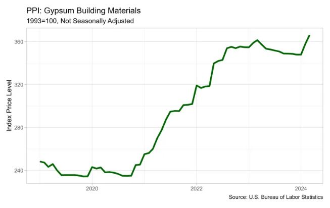 For gypsum building materials, the non-seasonally adjusted PPI increased 2.24% in March, representing the second consecutive month of growth. The index reached a new high in March was 1.33% higher than March of 2023.