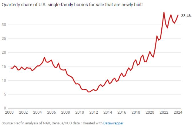 One-third (33.4%) of single-family homes for sale in the U.S. in the first quarter were newly built, essentially unchanged from a year earlier but down from a record-high 34.5% two years earlier. The portion of housing supply that¡¯s newly built is still roughly double pre-pandemic levels, according to a report from Redfin..