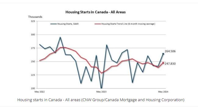 Increase driven by multi-unit construction in major cities The total monthly seasonally adjusted annual rate (SAAR) of housing starts for all areas in Canada increased 10 per cent in May (264,506 units) compared to April (241,111), according to Canada Mortgage and Housing Corporation (CMHC). ¡°The focus for homebuilders remains on multi-unit construction in Canada¡¯s major centres as both the SAAR and Trend of housing starts increased in May, following two consecutive months of decline. This was due to growth in actual year-over-year starts, driven by significantly higher multi-unit starts, particularly in Montreal and Quebec. While this is good news for housing supply, we do expect downward pressure on starts through the rest of 2024,¡± said Bob Dugan, CMHC¡¯s chief economist. The six-month trend in housing starts increased 3.8 per cent from 238,859 units in April to 247,830 units in May. The trend measure is a six-month moving average of the SAAR of total housing starts for all areas in Canada. The actual number of housing starts across Canada in urban centres of 10,000 population and over was up 39 per cent to 21,652 units in May compared to 15,606 units in May 2023. The year-over-year increase was driven by higher multi-unit starts, up 49% and higher single-detached starts, up 6%. May¡¯s total actual housing starts were higher in two of Canada¡¯s three major cities, with Toronto up 26% and Montr¨¦al up 200% compared to May a year ago. Vancouver declined 13%. Montreal¡¯s total starts result was driven by a 59% increase in single-detached starts and a 218% increase in multi-unit starts versus May 2023. Source: CMHC |