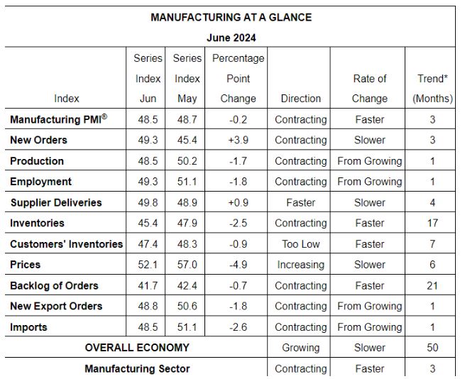 U.S. manufacturing activity contracted in June for the third consecutive month and the 19th time in the last 20 months, according to the latest report from the Institute for Supply Management (ISM). The furniture manufacturing industry was one notable bright spot in the report, being one of eight sectors that saw growth. The report was issued today by Timothy R. Fiore, CPSM, C.P.M., Chair of the Institute for Supply Management (ISM) Manufacturing Business Survey Committee: "The Manufacturing PMI registered 48.5 percent in June, down 0.2 percentage point from the 48.7 percent recorded in May. The overall economy continued in expansion for the 50th month after one month of contraction in April 2020. (A Manufacturing PMI above 42.5 percent, over a period of time, generally indicates an expansion of the overall economy.) The New Orders Index remained in contraction territory, registering 49.3 percent, 3.9 percentage points higher than the 45.4 percent recorded in May. The June reading of the Production Index (48.5 percent) is 1.7 percentage points lower than May's figure of 50.2 percent. The Prices Index registered 52.1 percent, down 4.9 percentage points compared to the reading of 57 percent in May. The Backlog of Orders Index registered 41.7 percent, down 0.7 percentage point compared to the 42.4 percent recorded in May. The Employment Index registered 49.3 percent, down 1.8 percentage points from May's figure of 51.1 percent. "The Supplier Deliveries Index remained in 'faster' territory, registering 49.8 percent, 0.9 percentage point higher than the 48.9 percent recorded in May. (Supplier Deliveries is the only ISM Report On Business index that is inversed; a reading of above 50 percent indicates slower deliveries, which is typical as the economy improves and customer demand increases.) The Inventories Index registered 45.4 percent, down 2.5 percentage points compared to May's reading of 47.9 percent. "The New Export Orders Index reading of 48.8 percent is 1.8 percentage points lower than the 50.6 percent registered in May. The Imports Index dropped into contraction territory, registering 48.5 percent, 2.6 percentage point lower than the 51.1 percent reported in May." Fiore continues, "U.S. manufacturing activity continued in contraction at the close of the second quarter. Demand was weak again, output declined, and inputs stayed accommodative. Demand slowing was reflected by the (1) New Orders Index improving to marginal contraction, (2) New Export Orders Index returning to contraction, (3) Backlog of Orders Index dropping into stronger contraction territory, and (4) Customers' Inventories Index moving into the low side of the 'just right' range, neutral for future production. Output (measured by the Production and Employment indexes) declined compared to May, with a combined 3.5-percentage point downward impact on the Manufacturing PMI calculation. Panelists' companies reduced production levels month over month as head count reductions continued in June. Inputs ! defined as supplier deliveries, inventories, prices and imports ! continued to accommodate future demand growth. The Prices Index eased but remained in expansion (or 'increasing') territory; the index registered its second month of cooling increases. "Demand remains subdued, as companies demonstrate an unwillingness to invest in capital and inventory due to current monetary policy and other conditions. Production execution was down compared to the previous month, likely causing revenue declines, putting pressure on profitability. Suppliers continue to have capacity, with lead times improving and shortages not as severe. Sixty-two percent of manufacturing gross domestic product (GDP) contracted in June, up from 55 percent in May. More concerning is the share of sector GDP registering a composite PMI calculation at or below 45 percent ! a good barometer of overall manufacturing weakness ! was 14 percent in June, 10 percentage points higher than the 4 percent reported in May," says Fiore. The eight manufacturing industries reporting growth in June ! in order ! are: Printing & Related Support Activities; Petroleum & Coal Products; Primary Metals; Furniture & Related Products; Paper Products; Chemical Products; Miscellaneous Manufacturing; and Nonmetallic Mineral Products. The nine industries reporting contraction in June ! in the following order ! are: Textile Mills; Machinery; Fabricated Metal Products; Wood Products; Transportation Equipment; Plastics & Rubber Products; Food, Beverage & Tobacco Products; Electrical Equipment, Appliances & Components; and Computer & Electronic Products. Source: ISM |