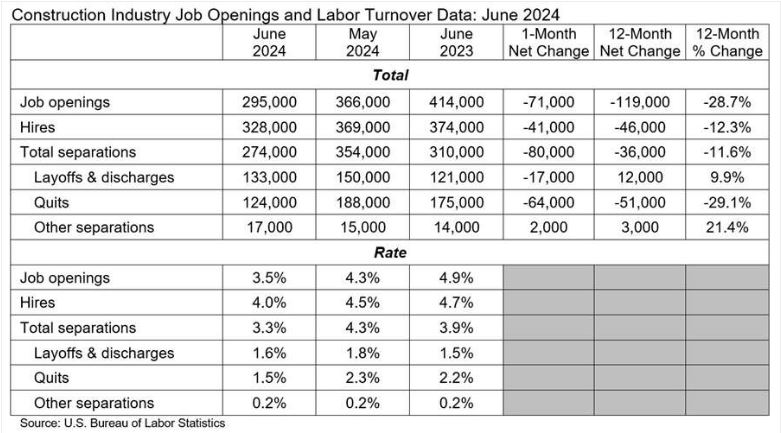 According to US Bureau of Labor Statistics¡¯ Job Openings and Labor Turnover Survey (JOLTS), the construction industry job openings dropped by 71,000 to 295,000. The JOLTS data defines a job opening as any unfilled positions for which an employer is actively recruiting. The US-based Associated Builders and Contractors (ABC) ¨C a national trade association representing the non-union construction industry ¨C said the 295,000 openings were the lowest figure since March 2023. In ABC¡¯s analysis, the association¡¯s chief economist, Anirban Basu, suggested the acute decline was due to a cyclical homebuilding market. ¡°More new housing units were completed in June than in any month since January 2007, and high interest rates have weighed on homebuilders¡¯ backlogs,¡± said Basu. Skilled-labour shortage not letting up Despite the dip, Basu said a consistently strong non-residential market will keep labour demands high. ¡°Non-residential construction retains momentum due to strength in certain segments like manufacturing and infrastructure, and that should keep the demand for labour elevated,¡± he said. ¡°A majority of contractors intend to increase their staffing levels over the next six months, according to ABC¡¯s Construction Confidence Index, while fewer than 9% of contractors expect their staffing levels to decrease over that span,¡± added Basu. Source: constructionbriefing.com |