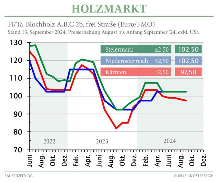 The report reflects the situation as at 13 September. The effects of the squalls on 14/15 September could not be estimated by the editorial deadline. Austria's industrial and construction sectors remain in recession. In the meantime, private consumption has also deteriorated and remains at a low level despite last year's wage increases and declining inflation. Current economic indicators do not point to any improvement in the near future. Needle saw logs The Austrian sawmill industry is generally receptive to spruce sawlogs. Demand and supply are currently in balance, partly because forest owners are focussing on processing calamities. There has been a regional upturn in demand, but this is not yet reflected in prices. Prices are stable and range between 87 - 105 euros for the leading spruce A/C 2b+ assortment throughout Austria. Demand for larch is very brisk and continues to exceed supply, with prices remaining mostly stable. Demand for pine is very uneven. While there is no demand in the south, marketing is possible in the north in consultation with customers. In the west, there was even a price increase. In Upper Austria, a softwood submission will take place at the beginning of December. Potential assortments need to be clarified in advance with the regional forestry agent. Industrial timber The paper, pulp and board industry sites are currently well stocked with coniferous industrial timber. Demand is normal and is currently mostly in line with supply. Removal and acceptance are taking place continuously. The price range for spruce fibrewood varies widely, but is stable at between EUR 63 - 98 per tonne atro. Demand for copper beech fibrewood is unchanged and ranges between EUR 80 - 100 per tonne atro throughout Austria. Energy wood Demand on the energy wood market is very low due to persistently high stock levels. Additional quantities outside of contracts are difficult to sell. The demand for high-quality firewood is also currently declining. It remains to be seen what effect the current cool weather will have. Timber is generally being transported quickly, but the extreme flooding in mid-September may have made forest roads temporarily unusable in parts of Austria. Regardless of the market situation, it is recommended to discuss planned utilisation with potential customers before the harvest and to specify quantities, delivery periods and prices in the final letter. All information on timber sales can be found at www.holz-fair-kaufen.at. All prices quoted refer to business transactions in the period August - beginning of September 2024 and are net prices to which VAT is to be added. The following tax rates apply to timber sales to entrepreneurs: 13% for all product ranges in the case of flat-rate VAT, 13% for energy wood/firewood and 20% for round timber in the case of standard taxation. Source: lko.at |