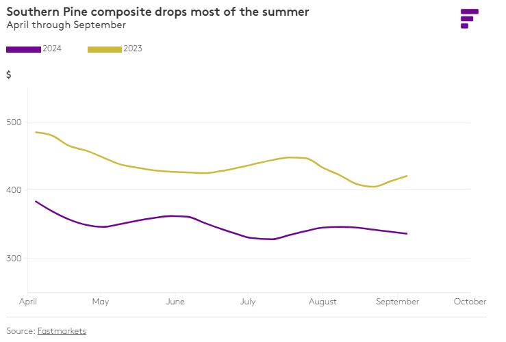 After a slight bump in prices in July, the Random Lengths Southern Pine Composite has trended down for most of August and September. Sales have picked up modestly in recent weeks, and narrow widths have stabilized or posted minor increases.