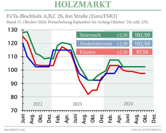 ![]() The storm, snow and rain events in mid-September caused damage to trees and forestry infrastructure. Regions in Styria and Lower Austria were particularly affected. However, there is no supply pressure for round sawn timber from the damaged timber. Due to the winter dormancy of the bark beetle, there is no time pressure for processing. Where damage to forest roads needs to be repaired, the damaged timber will only have a delayed effect on the market. The domestic sawmill industry usually has sufficient stocks of coniferous round timber, although demand is currently picking up. Slight price increases are possible in Upper Austria, Salzburg, Tyrol and Vorarlberg. Timber harvesting activities are currently mostly limited to damaged timber. Where the infrastructure is intact, the assortments provided are transported away quickly. The leading assortment of spruce A/C 2b+ achieves between 90 and 110 euros/FMO throughout Austria. A slight increase in demand can also be expected for pine due to price increases in Burgenland, Upper Austria and Styria. Larch is in high demand with stable prices and demand is exceeding supply. The locations of the paper, board and pulp industries are very well stocked with coniferous industrial timber.However, due to the increased supply caused by the calamity, the supply and therefore also the removal of wood from the forest is stagnating in some places.Prices are still stable.Demand for beech fibre wood is also stable. On the energy wood market, high stock levels - mostly from the previous season - are ensuring very restrained demand. Quantities outside of long-term contracts are almost impossible to market.A revival is only expected in the course of the coming heating season.The firewood market is also currently saturated.In some cases, stocks are being cleared at ¡®rock-bottom prices¡¯. The coming months should be used to process damaged timber so that no material suitable for breeding is available for the next bark beetle season. All prices quoted relate to transactions in the period from August to the beginning of October 2024 and are net prices to which VAT must be added.The following tax rates apply to timber sales to entrepreneurs: 13 % for all product ranges in the case of flat-rate VAT, 13 % for energy wood/firewood and 20 % for round timber in the case of standard taxation. Source: LK Österreich |
