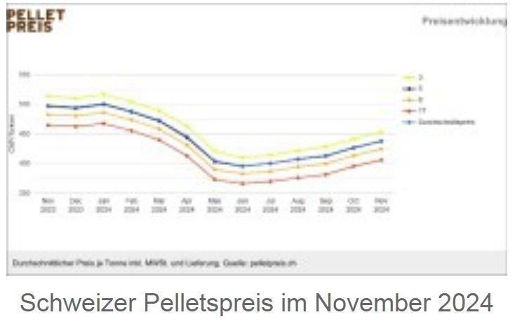 The Swiss pellet price in October 2024 rose by 2.6 per cent on the previous month to an average of 438.10 per tonne. This was reported by Pelletpreis.ch. According to Pelletpreis.ch, the Swiss pellet price in November 2024 is 11.9 per cent lower than a year ago, when it was CHF 497.50. The current average price is based on information from 26 suppliers. ![]()