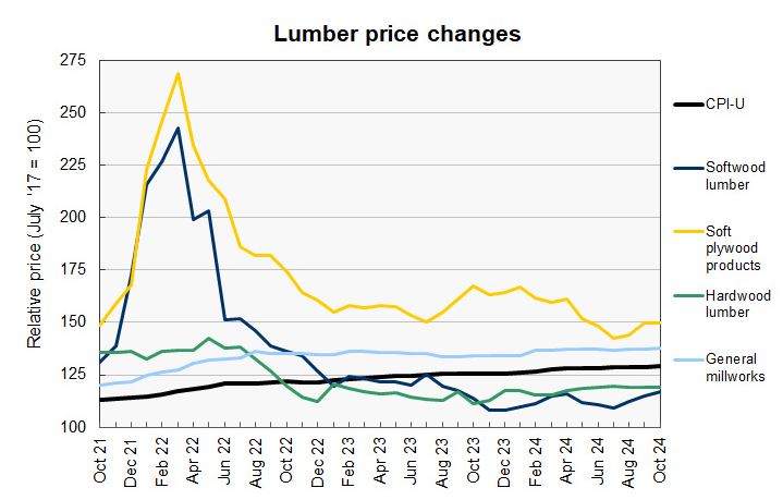 The producer price index (PPI) report from the Bureau of Labor Statistics (BLS) stated that construction materials prices rose 0.3 percent month-over-month in October on a seasonally adjusted basis. However, the change in construction materials prices for September was revised 0.1 percentage point lower. September¡¯s prices are now listed as being unchanged for the month. The index of components and materials for construction was up 1.0 percent from its year-earlier level. Overall prices for processed goods for intermediate demand were up 0.5 percent for the month. The volatile prices of processed fuels and lubricants rose 1.2 percent. The overall processed goods for intermediate demand index was 1.2 percent lower than its year-earlier level. For reference, the changes in these indices compare with a 2.6 percent rise in the all-items consumer price index (CPI-U) for the 12 months ending in October. Yield Pro compiled the BLS reported changes for our standard list of construction materials prices. These are prices of materials which directly impact the cost of constructing an apartment building. The first two right hand columns of the table provide the percent change in the price of the commodity from a year earlier (12 Mo PC Change) and the percent change in price from September (1 Mo PC Change). If no price data is available for a given commodity, the change is listed as N/A. The pre-COVID column lists the change in the current construction materials prices relative to the average of prices from December 2019 through February 2020, before the pandemic impacted the economy. This provides a longer-term view of construction materials price trends. The prices used by the BLS in compiling the indexes are collected on the Tuesday of the week containing the 13th day of the month. In September that would have been September 15. In the October report, the data collection date will be October 12. The first chart, below, shows the price index history for wood products over the past 37 months. ¡¡ After reaching a recent low in July, softwood lumber price