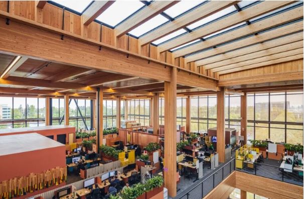 Biophilic Elements: Large skylights, floor-to-ceiling windows, and exposed mass timber surfaces create a natural, calming aesthetic. This nature-inspired design has improved employee well-being, focus, and creativity.