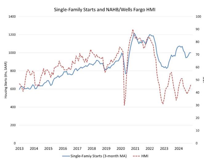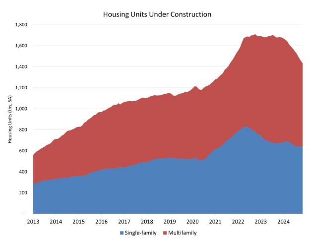 Ongoing lean levels of single-family existing home inventory helped to boost single-family production in November, while overall housing production fell because of a double-digit percentage drop in multifamily construction. Overall housing starts decreased 1.8% in November to a seasonally adjusted annual rate of 1.29 million units, according to a report from the U.S. Department of Housing and Urban Development and the U.S. Census Bureau. The November reading of 1.29 million starts is the number of housing units builders would begin if development kept this pace for the next 12 months. Within this overall number, single-family starts increased 6.4% to a 1.01 million seasonally adjusted annual rate. On a year-to-date basis, single-family construction is up 7.2%. The multifamily sector, which includes apartment buildings and condos, decreased 23.2% to an annualized 278,000 pace. While the pace of single-family starts increased in November, single-family permitting was flat as builders face mixed market conditions that include an election result that promises a focus on regulatory relief, but ongoing elevated mortgage rates. NAHB is forecasting single-family starts to post a slight increase in 2025 as the financing conditions for builders improve modestly. The significant decline for apartment construction is forecasted to end next year, with that market stabilizing during the second half of 2025. ![]() On a regional and year-to-date basis, combined single-family and multifamily starts are 7.3% higher in the Northeast, 2.4% lower in the Midwest, 5.8% lower in the South and 5.9% lower in the West. Overall permits increased 6.1% to a 1.51 million unit annualized rate in November. Single-family permits increased 0.1% to a 972,000 unit rate and are up 8.0% on a year-to-date basis. Multifamily permits increased 19.0% to an annualized 533,000 pace. Looking at regional data on a year-to-date basis, permits are 3.2% higher in the Northeast, 4.8% higher in the Midwest, 2.5% lower in the South and 7.0% lower in the West. ![]() The number of single-family units under construction is down 6.3% from a year ago, declining to 637,000 homes. The number of multifamily units under construction is down 20.5% from a year ago, to 797,000 units. In November, there were two multifamily units completed for every one unit starting construction. Two years ago, there were just 0.7 multifamily units being completed for every 1 unit starting construction. The count of multifamily units in 5-plus unit properties units completing construction of is up 36.1% on a year-to-date basis for 2024. In contrast, single-family completions are up 3.6% on a year-to-date basis. Source: eyeonhousing.org |