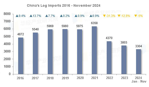 of 3.7%.In November 2024, China's log imports were 2.84 million