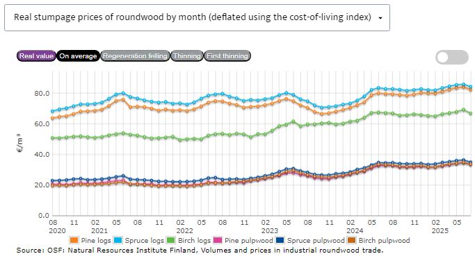 Unit prices in roundwood trade are recorded in the statistical database at the fair prices valid each time. However, price changes are examined in the texts and graphs in real terms by eliminating the change in value using the cost-of-living index. In July 2025, the annual increase in consumer prices was around 0.2 per cent.