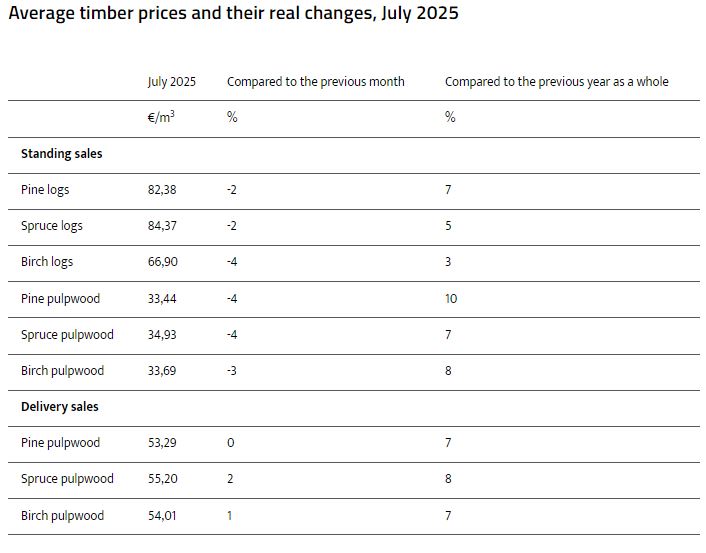-- Prices for all timber assortments in standing sales decreased noticeably in July, yet remained 3–10% higher than the average prices for the entire previous year.