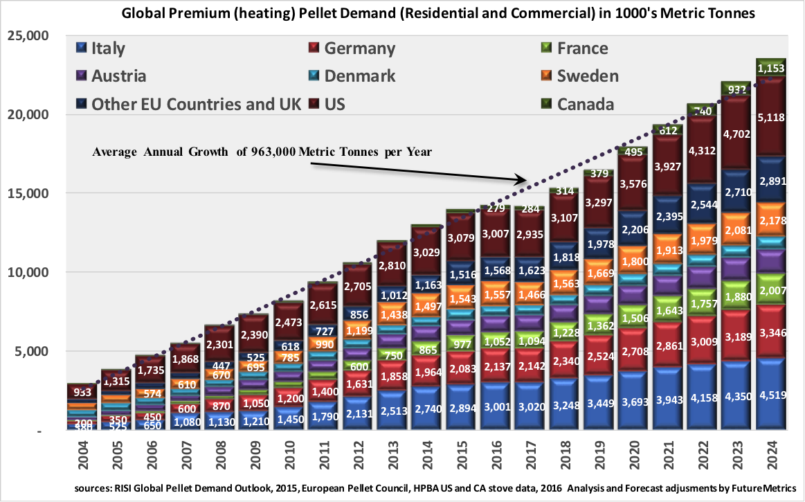 Future demand in the U.K. and E.U. is expected to plateau by 2020. However major growth is expected in Japan, and Korea in the 2020s. Canada has the potential to experience increasing demand for industrial pellets. That is due to decarbonization policies from the Canadian federal government and specific policies in provinces such as Alberta. FutureMetrics has two recent presentations with details on the forecasts for Canada and Japan. The presentation on the Canadian markets with a specific focus on Alberta is HERE. The presentation about the Japanese markets is